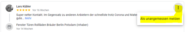 Mit Klick auf das 3-Punkt-Menü rechts neben der Bewertung kann man diese als unangemessen melden.
